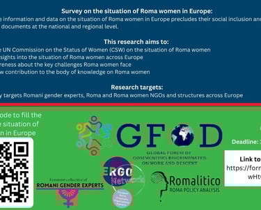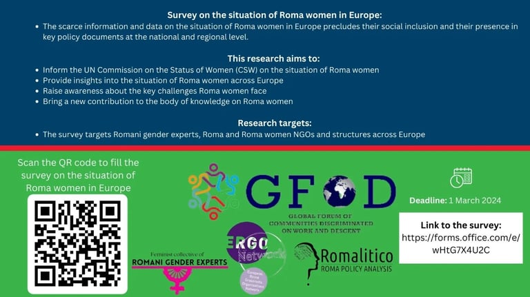 The survey targets Romani gender experts, Roma, and Roma women NGOs and structures across Europe